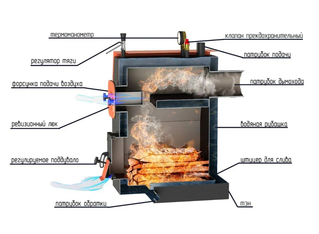 Сгорание топлива в топке происходит в режиме газогенерации, что позволяет во много раз уменьшить расход топлива. Камера сгорания разделена на три части. В нижней части происходит пиролиз (тление) топлива, а в верхних отделах вторичный дожиг выделившихся газов, с помощью форсунки дожига и инжекторов.